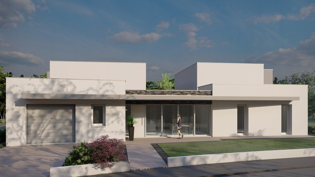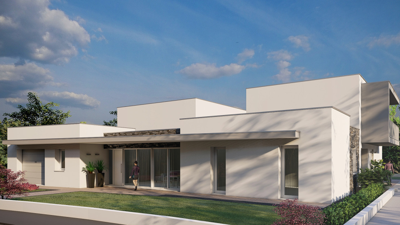 La soluzione si sviluppa su un unico livello ed è composta da un ampia e luminosa zona giorno con soggiorno e cucina abitabile, tre camere a scalare, due bagni e due disimpegni e garage.